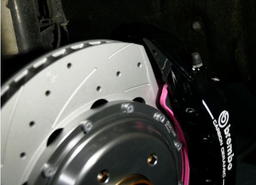 這輛寶馬3系改裝DICASE 380X34mm剎車孔線盤。看起來這款剎車盤很普通,但是其散熱性能比較好,對剎車的熱衰減還是有一定幫助的,提升剎車最主要的還是提升制動距離,這個方面就是劃線盤比較好一點啦,因為同樣大小的盤,卡鉗也是一樣的,剎車皮的摩擦面積也是一樣的,但是因為孔盤盤面上的散熱小孔減少了有效的摩擦面積,而劃線盤這方面就會好很多,所以在制動力上,是劃線盤稍微強(qiáng)一點。