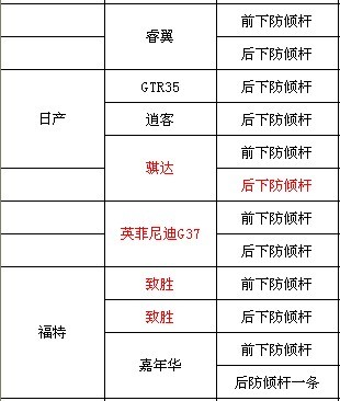 驪威防傾桿、頤達防傾桿、騏達防傾桿、軒逸防傾桿、天籟防傾桿、GT-R35防傾桿、英菲尼迪G25防傾桿、英菲尼迪G35防傾桿、英菲尼迪G37防傾桿、350Z防傾桿、