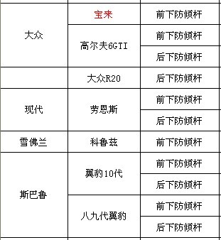 伊蘭特防傾桿、悅動防傾桿、酷派防傾桿、勞恩斯防傾桿、賽拉圖防傾桿、福瑞迪防傾桿