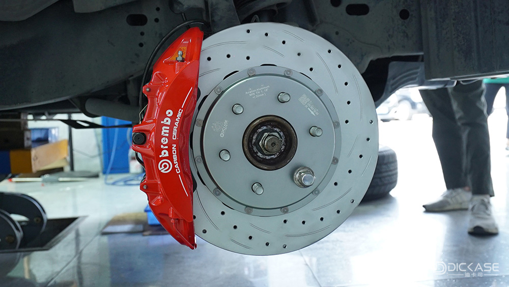 但原車輪轂18寸,原車四活塞剎車卡鉗,剎車腳感偏軟,操控性能較弱。直升布雷博V6六活塞卡鉗,配DICASE362mm剎車盤,制動提升完颯剎車
